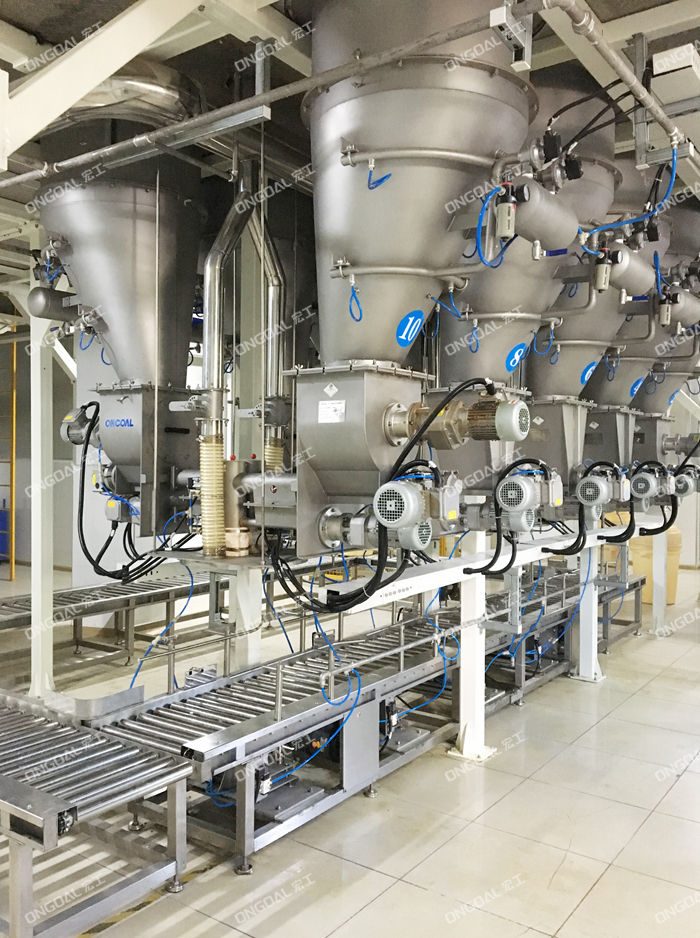 配料系統(tǒng)的工作流程是:人工將物料利用提升機(jī)提升至平臺;人工將物料分別放到對應(yīng)的料倉;設(shè)定配方--人工將周轉(zhuǎn)桶放到輸送線入口一周轉(zhuǎn)桶定位--喂料機(jī)將物料送入周轉(zhuǎn)桶;計(jì)量稱精確稱重一由輸送機(jī)自動輸送到下一單元重復(fù)配料-周轉(zhuǎn)桶自動輸送到出口,人工收集放標(biāo)識卡。